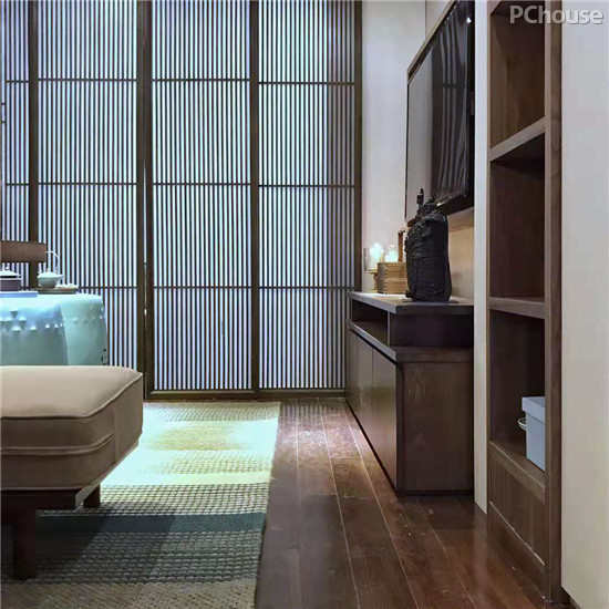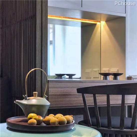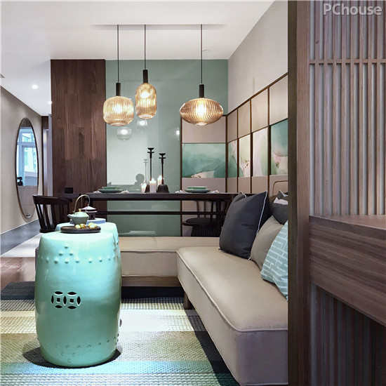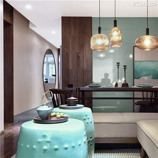 通过颜色来呈现新东方设计风格,于是设计师对于房屋漆面、地板、以及柜体家具都进行了严格的色彩筛选。