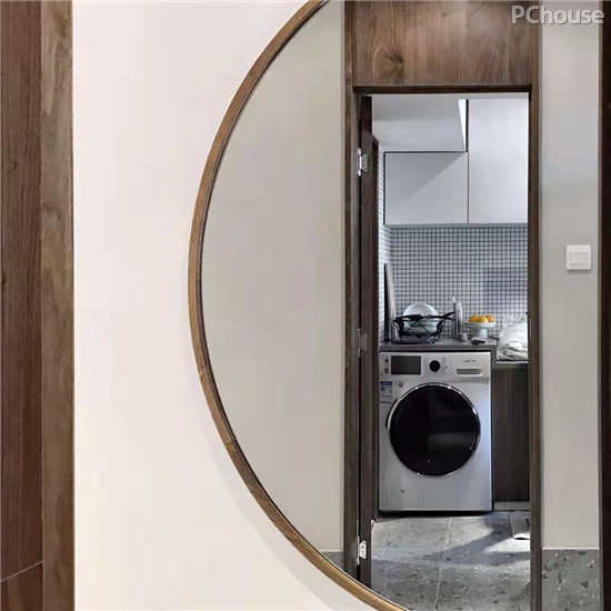 为了解决走道在视觉上的狭长感,设计师在过道上增加了一面直径近两米的圆镜,既延伸了空间,又有了中式月亮门的意境。