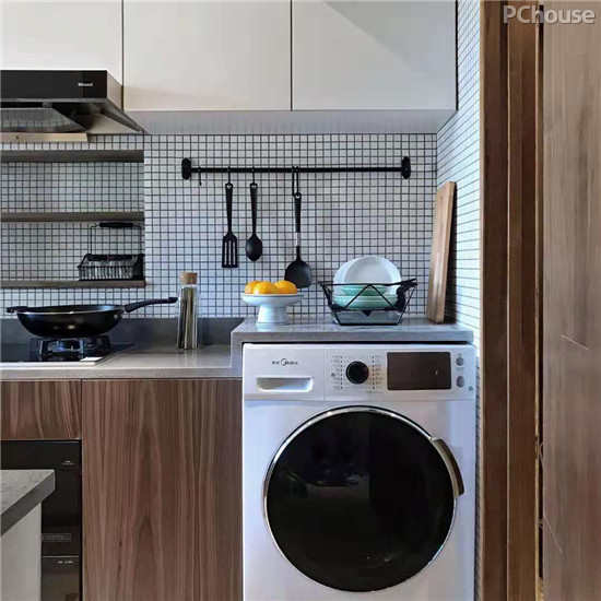 设计师选择了带有烘干功能的洗衣机,而入门处的小阳台,则可以在需要时用作晾晒的区域。