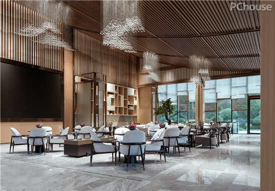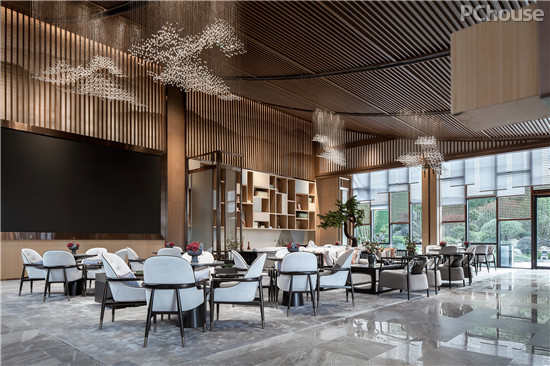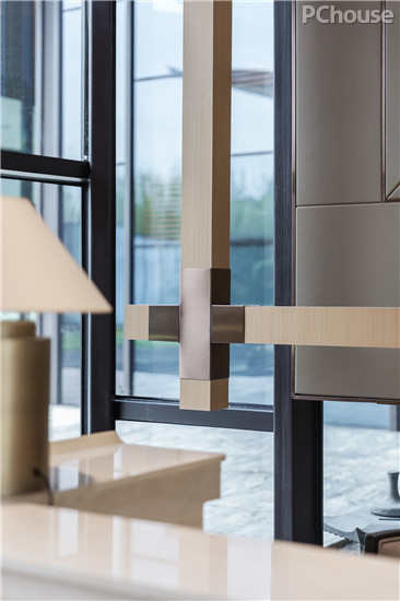 隐约的山形水晶吊灯,以疏密高低层次在空间中勾勒出意境之美,将西式元素现代东方化。以简饰繁,线条明朗,呈现出大道至简、清远悠长的东方气韵。