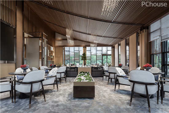 贵宾室墙面两条金属营造虚实相交的疏离感,于通透中增添了光影的流转,形成静谧,内敛平和的洽谈氛围。中间设立了一处长形茶桌区,在这里感受一茶一世界,一壶一人生东方优雅奢华的生活。