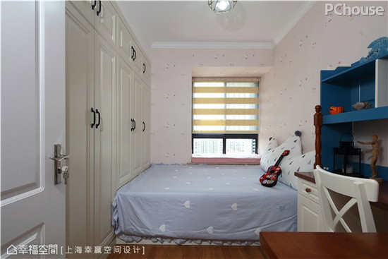 编辑点评:以爽朗的蓝色系吸睛,幸赢设计以使用者喜爱的色彩为空间添妆,配上粉红壁纸满足小朋友的公主梦。