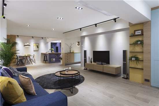 编辑点评:为消除客厅横梁的量体感,垂直面搭配白色收纳柜舒缓视觉,部分区块规划开放式层架,屋主可摆放装饰物或常使用的物件。