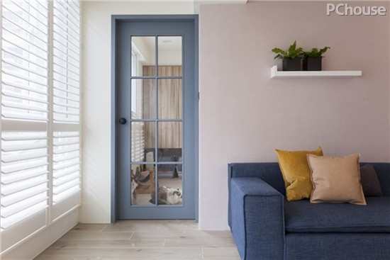 编辑点评:客厅区除了午夜蓝色沙发与角落蛋黄色柱子较为醒目,其余保持素朴简净,让纯白木百叶窗筛入的光线温柔照进室内。