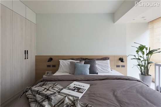 编辑点评:卧室的色调彩度降低能减少感官刺激,让屋主获得充分休息,主卧衣柜提供充足的收纳机能。