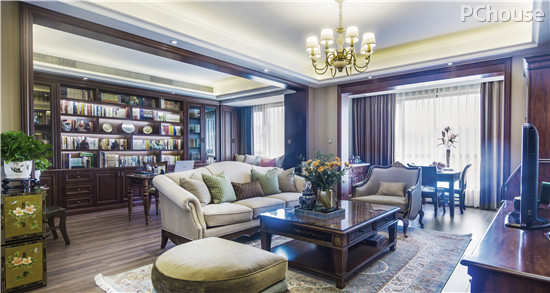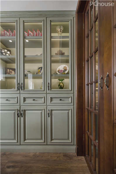 客厅及开放式书房里灰绿和深褐色木材的搭配,增加了空间的厚重感觉,