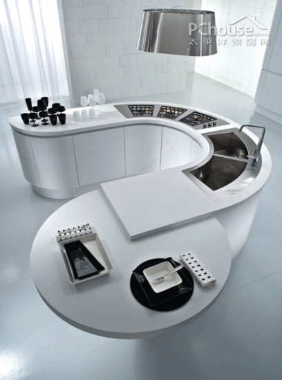 编辑点评:纯白的家具是时尚的典型。烹饪台的造型极具线条流动感。金属质的吊灯也是为数不多的装饰物之一。与整体造型风格一致,是顶级时髦的空间设计。
