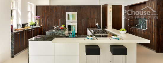 编辑点评:蓝灰色深沉、成熟,是极具时尚个性的色彩。在白色的墙壁中嵌入蓝灰色的元素,用简约的线条打造接近自然的简约时尚岛屿厨房。
