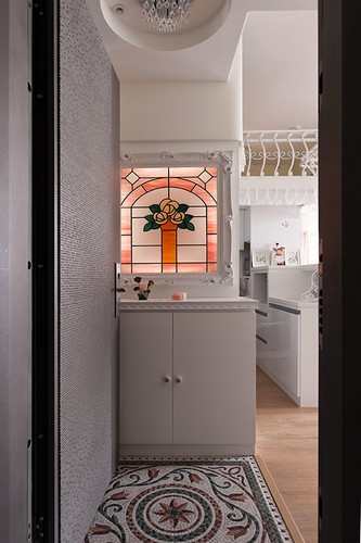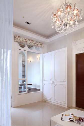 从挑高客厅天花悬垂而下的华美水晶吊灯,在锻造造型栏杆的衬托下,营造华丽梦幻的公主房氛围。精算过比例的大理石马赛克拼贴磁砖,框饰出小豪宅的精致品味。照明光源从端景墙上的彩绘玻璃投射而出,再加上一旁菱格纹线条修饰的穿衣镜,在几近一坪大的玄关空间,即可看出设计师及屋主,对细节的讲究及美感的品味。