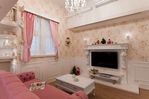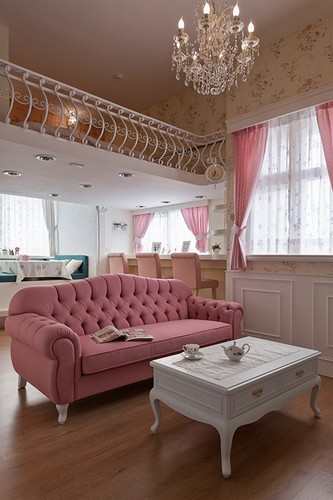 粉红色的沙发搭配上古典线条的茶几,窗外的风轻拂过窗台上白色蕾丝窗帘,将童话公主的梦幻氛围推展到极致。