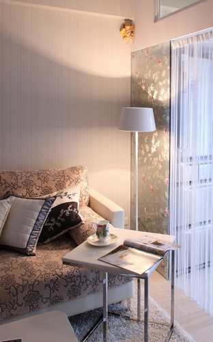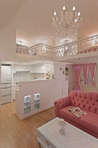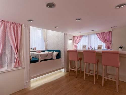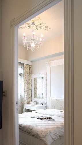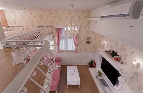 白色的蕾丝、匀畅流转的白色锻造线条、繁复精致的法式线板、粉红色的沙发,结合这些元素搭构起来,在你的脑海里会出现什么样风格的住家?是Hello kitty的粉红公主房?还是童话公主的浪漫城堡?这样强烈主题的空间,设计师就把这样的童话公主风住家搬到现实生活中啦!17坪大的跃层空间是屋主的休闲渡假会馆,在设计之初,就希望能融入男主人喜欢的法式线板,及女主人收藏的日式杂货,因此设计师以展示收藏日式杂货为设计基调,融合法式线板remix出独一无二的法式浪漫温馨空间。