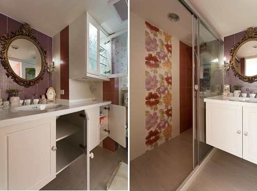 设计师不仅在镜面四角喷饰花朵图腾,连水龙头亦挑选浪漫的设计线条。(幸福空间供稿)