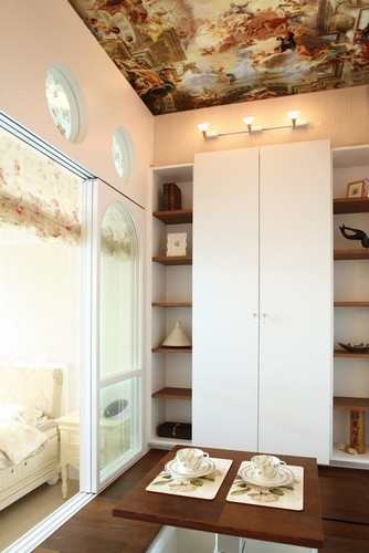 仰望的角度看见天使们翩飞于丰润瑰丽的云彩里,教堂穹顶的天国壁画带出路易十四时期的凡尔赛风华,少去镶金线条改以纯白呈现法式浪漫,轻缀施华洛士奇水晶提升精致美感,拾雅客设计在十三坪小空间里实现屋主的浪漫公主梦。
