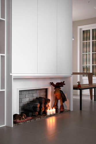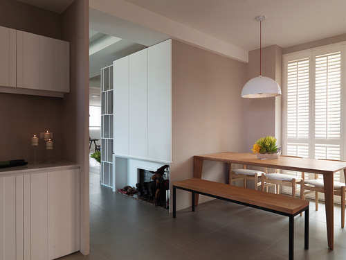 为满足屋主一家人每年过圣诞节的期待,设计师运用玄关背向做出造型壁炉,同时也化解了风水中穿堂煞的疑虑。