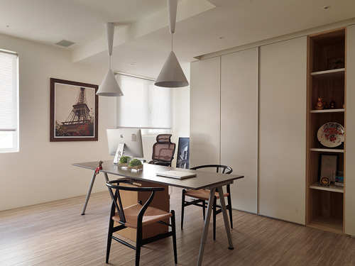 除了基本的空间配置,工作室是需要长时间在家办公女主人的重要需求。由于屋主长期国外出差,居家中有许多的纪念品及备品,规划之初陶玺设计将其物品逐一丈量,依属性规划了足量收纳。