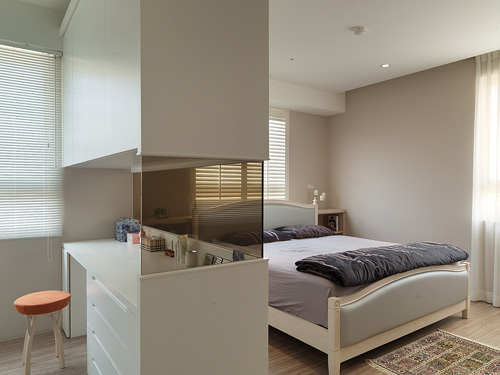 设计师利用梁下及柱体旁空间规划书柜及书桌,避开床头压梁的空间问题。(幸福空间供稿)