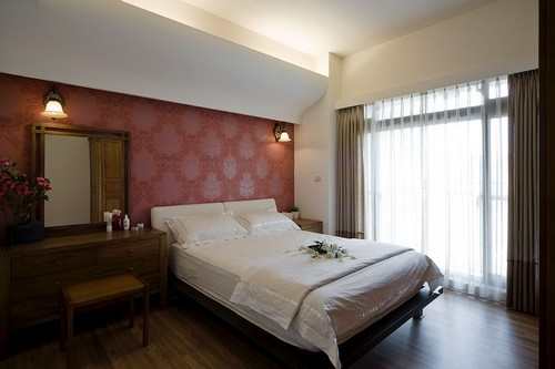 混搭柚木实木家具与现成木作柜体,只见美式优雅。沿墙规划的大型衣柜打造美式情调,连电视也一并收纳进柜体设计中。