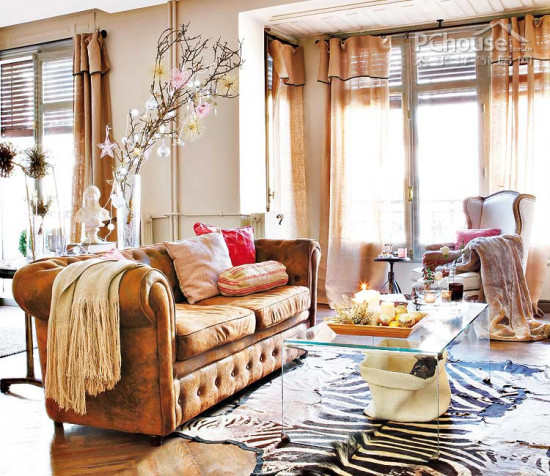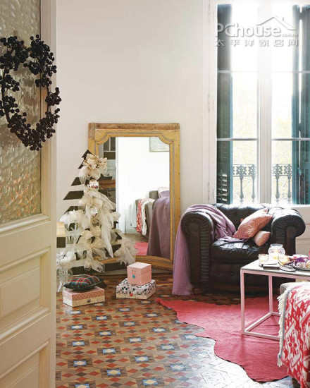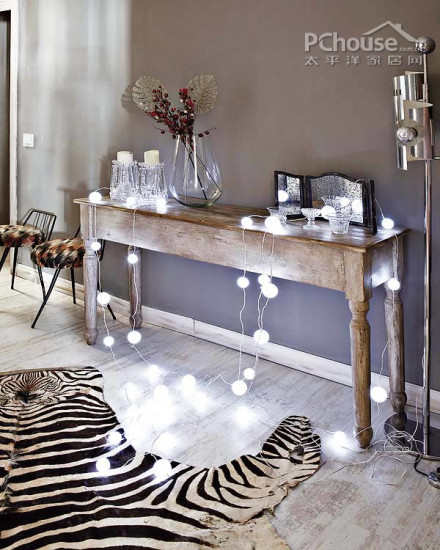 编辑点评:客厅中摆放的大瓶玻璃樽中插着中只是一把无花的藤条,而灯泡与塑料雪花的缠绕就使其灵意十足。