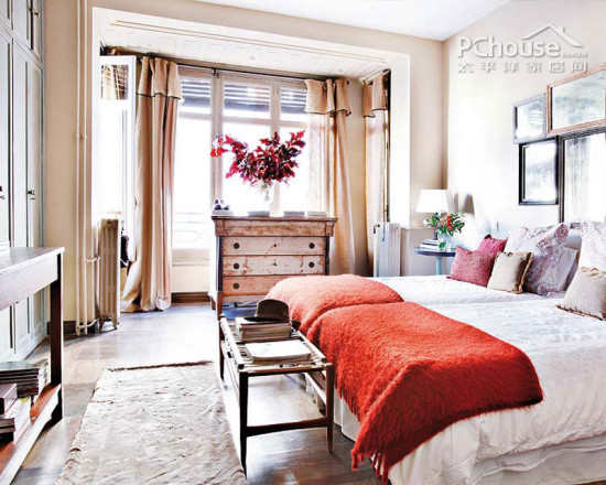 编辑点评:卧室的设计十分高贵大气,红色的床品与柜上的插花色彩吻合,正是卧室中一抹浓情的艳丽。