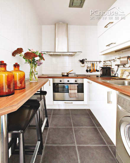 编辑点评:长条形的厨房线条明了,小棒大红的花束色彩艳丽,芬芳了满个厨房。