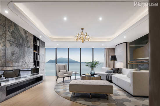 大面积的通体落地窗,以最大尺度对湾区进行场景化定格,将绝美风光引入室内,纵目远观,独属于海边的惬意感受得以铺陈抒发。开敞式的生活起居区功能协调连贯,曲线优美的背景墙作为停顿穿插其中,隔而不断,避免空间的冗长感,与窗外连绵不绝的海景呼应成趣。