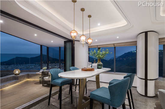 开放式party空间搭配高脚吧台与户外沙发,别致的吊灯自天花落下,融合奢华与温馨,延伸出屋顶泳池荡漾。室内外边界被模糊,轻松过渡至大自然,一袭碧色于无边际的海天之间生动渲染,随光影姿态变幻的景色让人忘情欣赏,沉浸在度假的怡然氛围,勾勒出生活的高贵韵味。