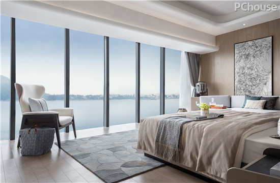 「海边的生活,期待的是心灵的放松与沉淀,不适合过多的赘述。」设计师说。卧室墙体与地面保持纯净,180°的海景作为巨幅杰出画作取代了其余装饰。几何线纹地毯,抽象艺术挂画,色泽柔和的定制沙发,无一不透露社会新锐回归质朴而内蕴深远的生活追求。
