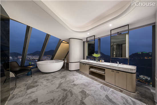 木饰背景墙与皮革床屏组合,诉说着主人低调奢华的个性。高雅大气的卡其色丝缎与沉稳睿智的蓝色饰品,不喧哗而独具格调。浴室线条简练利落,保持大面积玻璃窗,强化了场所的穿透感,接受阳光更为纯粹的洗礼。临窗望海的全景浴缸,领略坐拥港湾的曼妙乐趣。傍晚时分,斜阳余晖洒入室内,整个空间都被抹上一层黄晕。潮起潮落,华灯初上,使居者充分体会设计师想要传递的闲适心境,尽享生活轻松喜悦的美好品味。