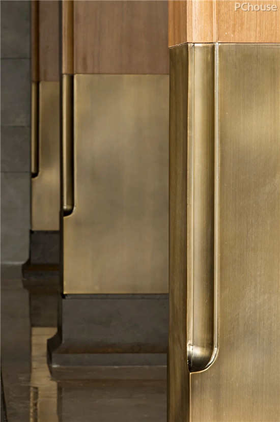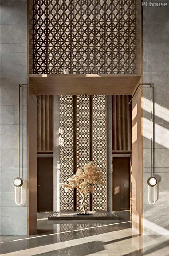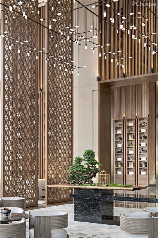 枯树,在东方文化中是一种古老的美学意向,寓意生衰。入口处,巍峨高耸的枯树将坚韧的品质注入前厅空间,历史的风云际会与古往今来的名流传奇交融成华丽的篇章,手工艺人用娴熟的技法将其绘入金色的朝云,以千山独行的傲然风骨层层席卷着感官与知觉,本真的智慧和美褪去了一切凡俗形迹。