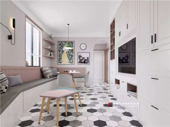 迎门的黑板墙记录生活中的点滴或全当装饰也未尝不可,将空间提纯,色彩过滤,用极简的线条弱化家具装饰的厚重,沉淀出北欧清新、明亮的家居氛围。地台完美的嵌入设计,提高层次,划分休闲空间。