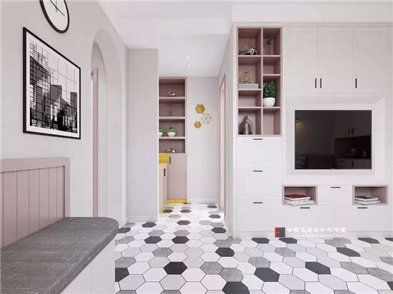 1.电视背景墙做成柜体,缓解进门无玄关衣帽鞋子没地儿放的尴尬,同时增加了更多的收纳空间。