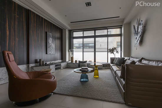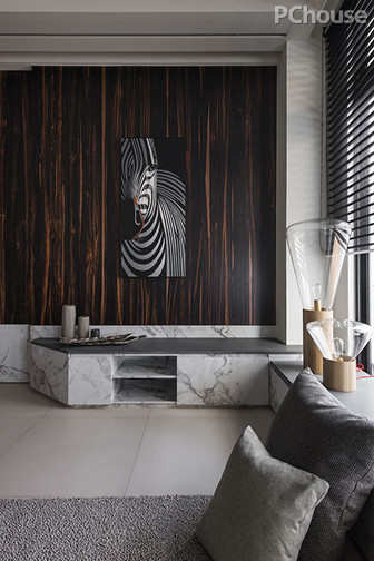 步入玄关,落地窗引领日光照亮入口,大胆破除玄关窄仄印象,敞开如同迎宾的体贴佈局;并以个性鲜明的大厅迎接屋主,搭配柔软的皮件傢俬承接疲倦的身心,更运用滑门设计为厅室营造起居空间的亲密氛围。一侧的赤木墙板与斑马壁画共构场域的野生,与阔叶壁饰围塑出荒野纹理,独具野性韵味的空间语汇突破落尘区固有样貌,随着远方隐约传来的嘶声抖落都市尘埃,无形中使心灵焕然新生。