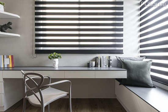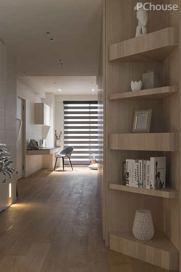 承接天井筛落的日光,得天独厚的空间散发遗世独立的静谧氛围,在一片清浅木质与简约立面围绕中,伴随斑马帘侧面透入的光线;设计师一笔挥走混浊的道路烟尘,令居住者犹如探身树木之心,重见光影流动的方式;抚触明亮逐渐沁润肌肤,全心沉淀于个人的阅读时光。