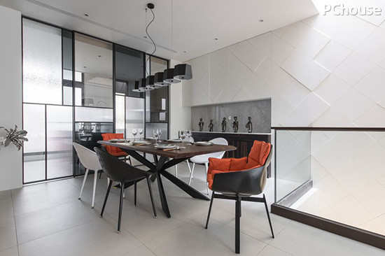 餐厨区採用轻盈的白色主调,划分理性的纯黑线条,点缀亮一色阶的橘布单椅,散发更为活跃的气息。延续客厅露台设计,将区域一隅改为天井,为用餐时刻挹注清爽感受;而菱格顶饰隐然唿应壁身图样,开启具现代趣味的光影嬉戏,亦暗示场域中有机组成的几何线条——块状拼接的手法自墙面延展至拉门,引领目光落入立于一侧的别緻门片,错落拼贴的渐层玻璃与不规则纹理,舒展家居的另一面风光增添与家人坐候佳餚的兴致;沿着蜂巢灯型饰垂悬而下,将满目笑意笼罩于流淌的蜜黄色泽之中。