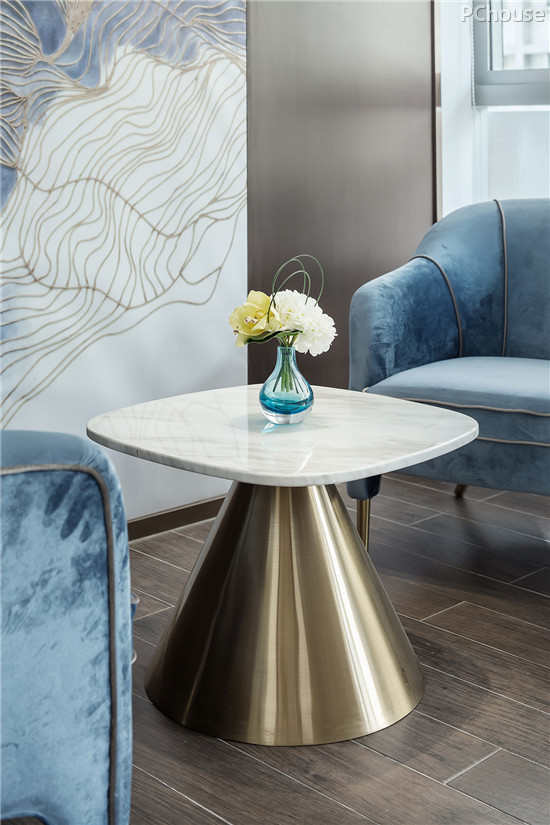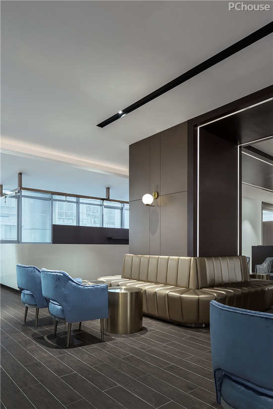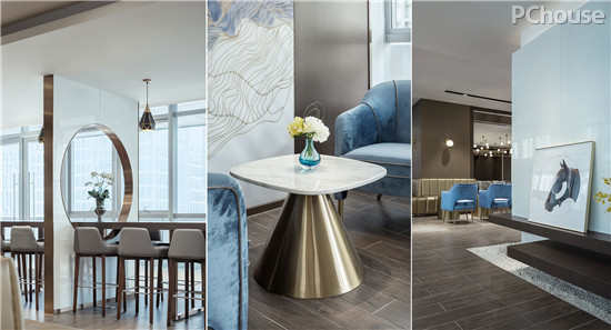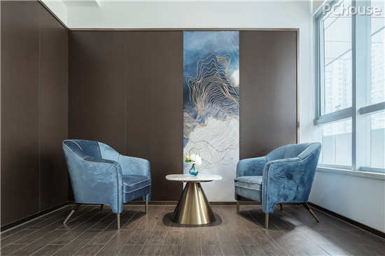 软装摈弃了高饱和度色调,选以灰蓝、淡赭等,即便是暗金色元素,其明度较低,既彰显内敛的奢华,也与空间格调相互契合。