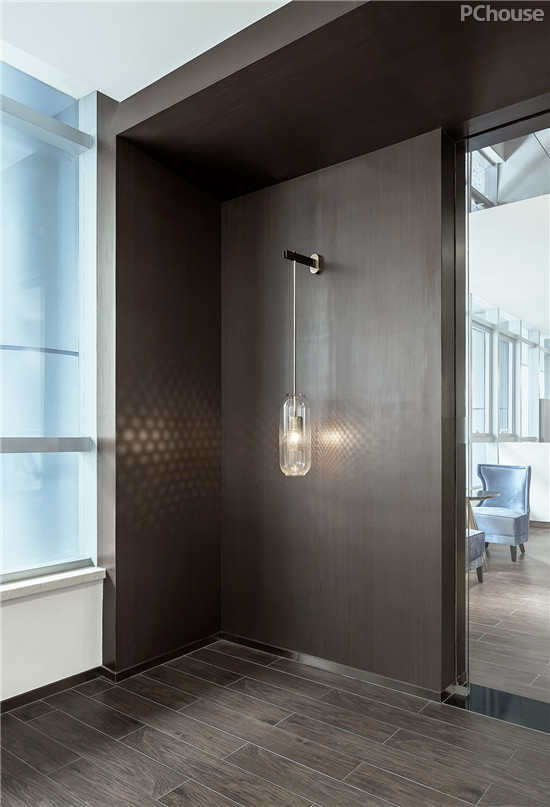有别于传统设计的用意在前厅便初露端倪,迎面的大片玻璃营造了空间的光亮通透。而人造光,以几何线条的美感从天花引至地面,光与影交互而生,若隐若浮,操纵着色影深浅。