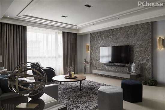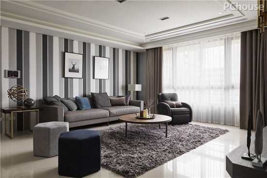 编辑点评:黑白灰经典色阶贯串公领域,客厅沙发背墙选用线条壁纸,以带有银色勾边的细节,藏入精致质感。