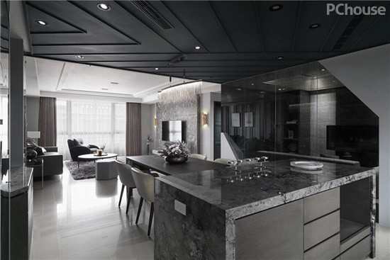 编辑点评:在现代俐落的线面秩序中,点缀低调隐奢带有个性感的华丽,例如中岛使用带有高雅灰质感的黑森林石材,立面则以茶镜切割造型,加上金属链条质感的设计灯具,皆与客厅电视墙完美映衬。