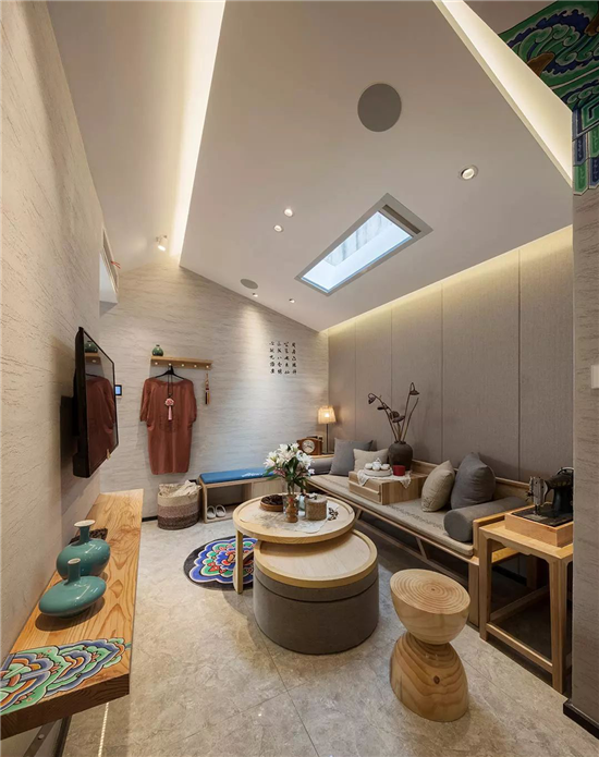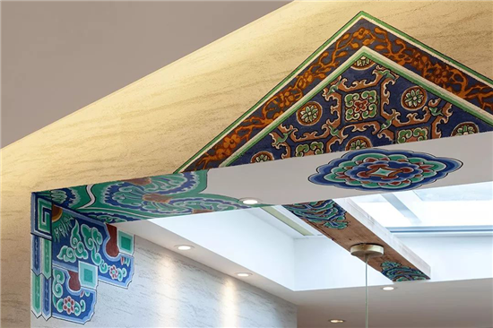 屋顶保留了原本的房梁加上了彩衣堂包袱锦苏式彩绘纹样。为现代化的老宅保留了一丝古朴的气息。