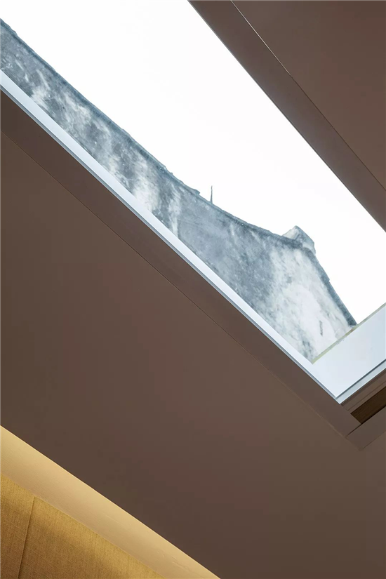 改造后设计师首先在屋顶开设天窗解决客厅没有窗户的采光问题,天窗加设智能的电动窗帘方便平时使用。