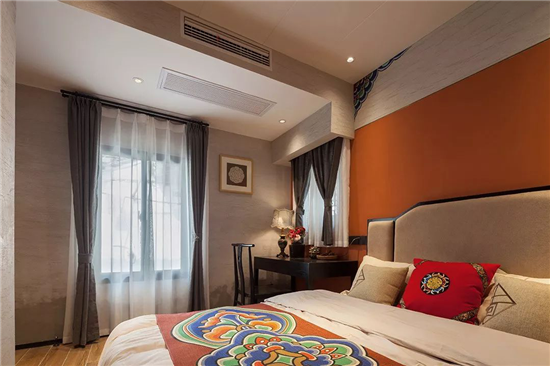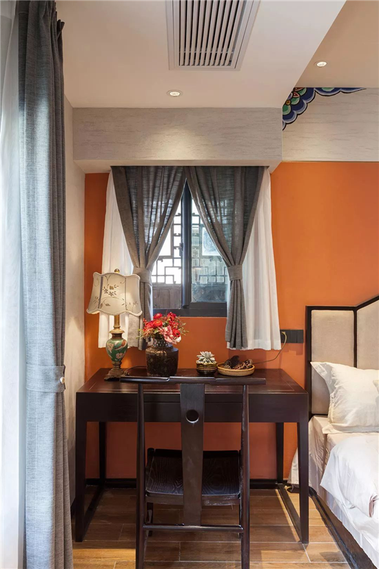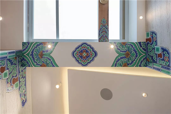 运用中国红作为空间点缀色,结合彩衣堂的包袱锦苏式彩绘元素加以修饰,使整个空间更加的青春具有活力。