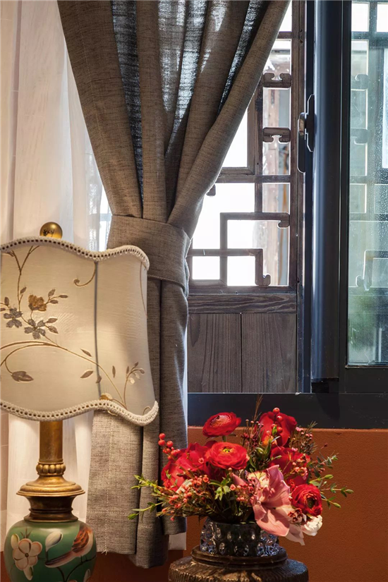 暖心的设计师将原有的缝纫机台翻新,铺上业主自己钩织的花边形成一个简易盆景台,为空间增加了一丝生机。