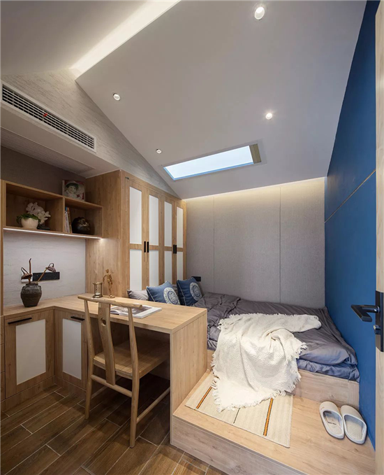 改造后设计师将次卧的床做成榻榻米的形式与床头衣柜相结合增加了卧室的收纳空间,同步增加出学习和阅读区域,方便户主儿子回来后使用。屋顶设置的天窗提升了次卧区域的整体采光。