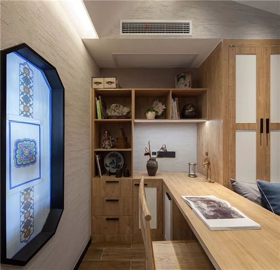 沙发加宽处理,在平日有客人时能充当床的作用,客厅茶几的旋转收纳, 既能增加空间的收纳,又不浪费空间。原木色的软装以及家具,具备现代使用功能的同时又不会失去老宅原有的气息。