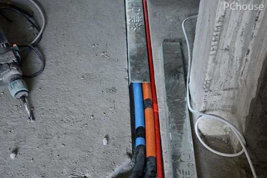 橙色管道为进水管,蓝色为回水管,细橙色为电源线,随后为地面铺设保温层和反射膜,再铺设散热管道