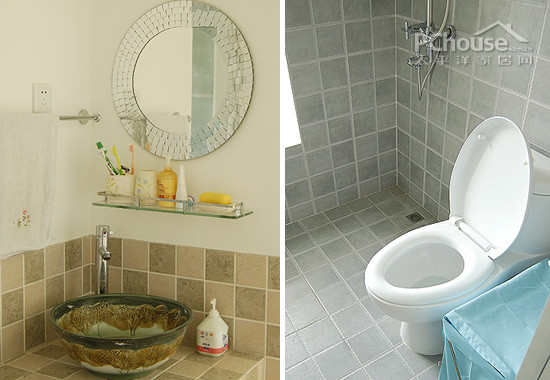 卫浴参考:干湿分区,洗手盘布置在外面,方便餐前餐后洗手。湿区面积较小,灰蓝的颜色既耐脏又相对清新一些。