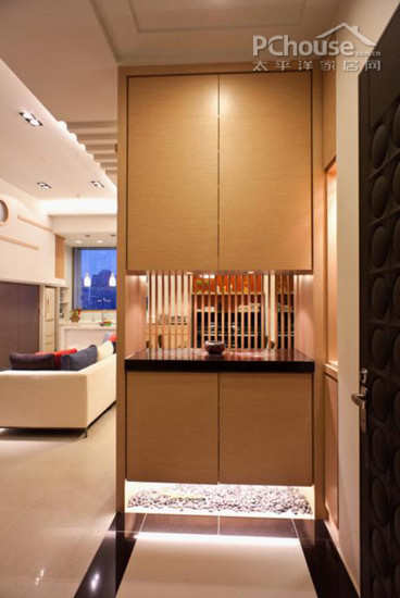 玄关参考:进门左侧,做一嵌入式玄关柜,满足日常出入的更衣需要。右侧加以白色镂空的屏风。