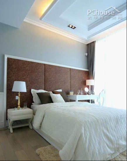 主卧参考:主卧室的设计依然沿袭客厅的色调,以白色为主搭配以软包。地面则以采用低明度,中性色调的地板地毯等柔性元素。