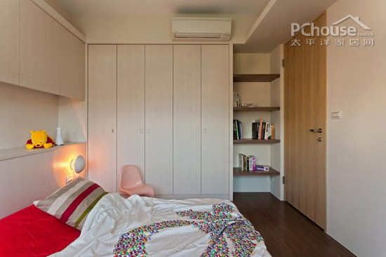 次卧参考:在影视墙做了通墙的隔板,靠近窗户的则是550的工作台,可写可读,亦可做工作台,也可做梳妆台,门后的部分则是根据墙体的限制,做开架或不开架的储藏柜,虽然不深,至少可以利用一下。见此图的门后。