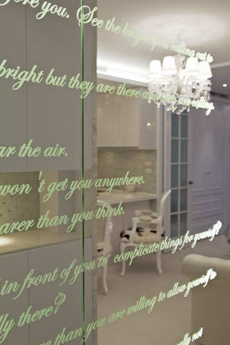 依循着喷砂字体,镜面谱下的人文诗性在灯光下低调显现,薄形门片的存在,用折射明亮收住了后方电表箱凌乱,开展起空间尺度。